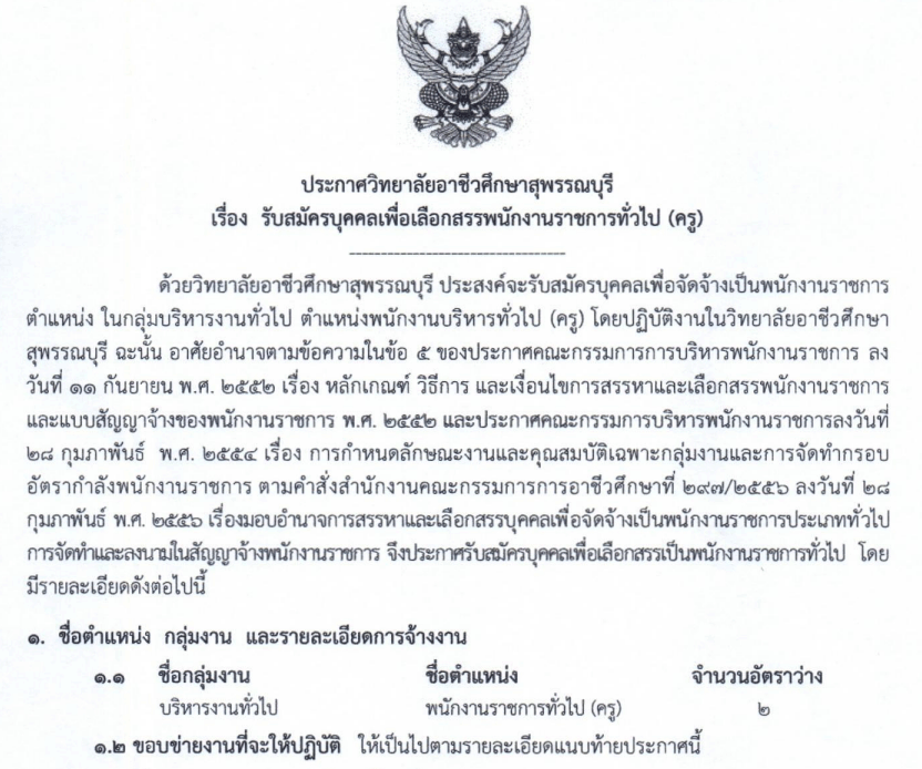 วิทยาลัยอาชีวศึกษาสุพรรณบุรี รับสมัครพนักงานราชการทั่วไป ตำแหน่ง เจ้าหน้าที่บริหารงานทั่วไป(ครู)