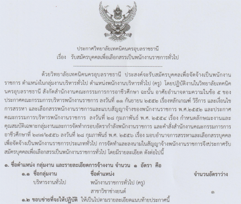 วิทยาลัยเทคนิคนครอุบลราชธานี รับสมัครพนักงานราชการทั่วไป ตำแหน่ง เจ้าหน้าที่บริหารงานทั่วไป(ครู)