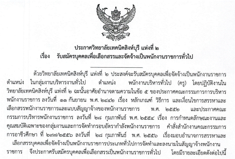 วิทยาลัยเทคนิคสิงห์บุรี รับสมัครพนักงานราชการทั่วไป ตำแหน่ง เจ้าหน้าที่บริหารงานทั่วไป(ครู)