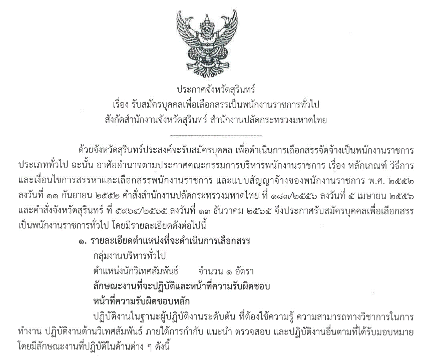 จังหวัดสุรินทร์ รับสมัครพนักงานราชการทั่วไป ตำแหน่ง นักวิเทศสัมพันธ์