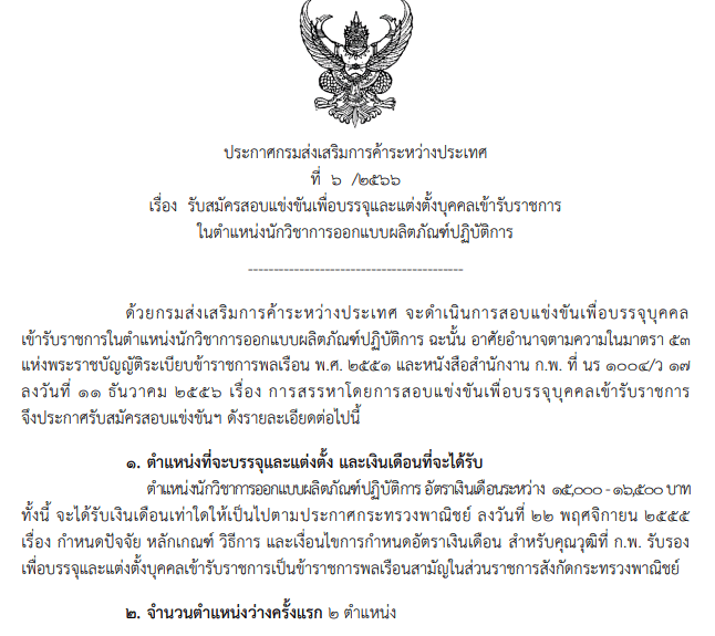 กรมส่งเสริมการค้าระหว่างประเทศ รับสมัครสอบแข่งขันเพื่อบรรจุและแต่งตั้งบุคคลเข้ารับราชการ ตำแหน่ง นักวิชาการออกแบบผลิตภัณฑ์ปฏิบัติการ สมัครออนไลน์ตั้งแต่วันที่ 3-26 เมษายน พ.ศ. 2566